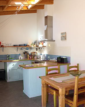 Dining table with chairs, with an adjoining open-plan kitchen hand-built with beech work-top, oven, hob, sink, microwave, toaster, cafetiere, kettle and juicer, cutlery, glasses and crockery for up to 6.