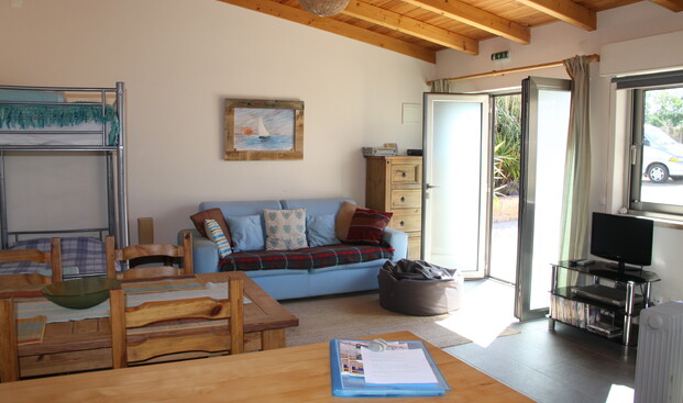 A large living area with sofa, bean bags, a TV for watching DVDs, plus a DVD collection. Free wifi.