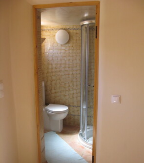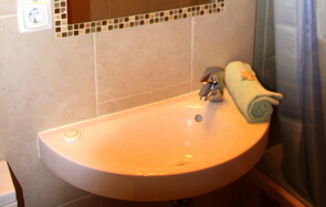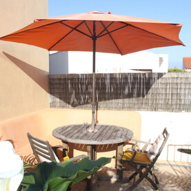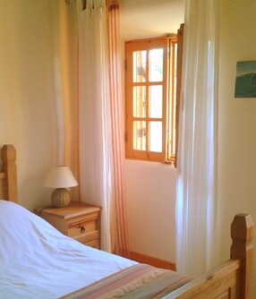 The main bedroom is very light and airy. It has a natural wooden floor and exposed wooden beams on the ceiling. A large comfortable double bed and two large wooden framed windows with shutters that open to let in the wonderful algarve sounds and scents.
