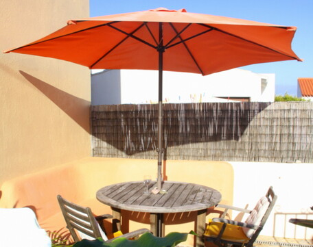 sunny patio garden complete with table, hand-built outdoor sofa, chairs, sunshade, lovely plants, a BBQ and an outside tap to wash off wetsuits and sandy feet.