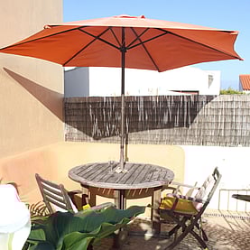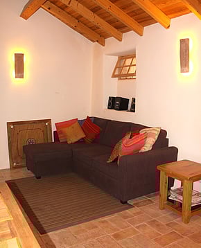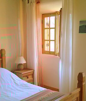 The main bedroom is very light and airy. It has a natural wooden floor and exposed wooden beams on the ceiling. A large comfortable double bed and two large wooden framed windows with shutters that open to let in the wonderful algarve sounds and scents.