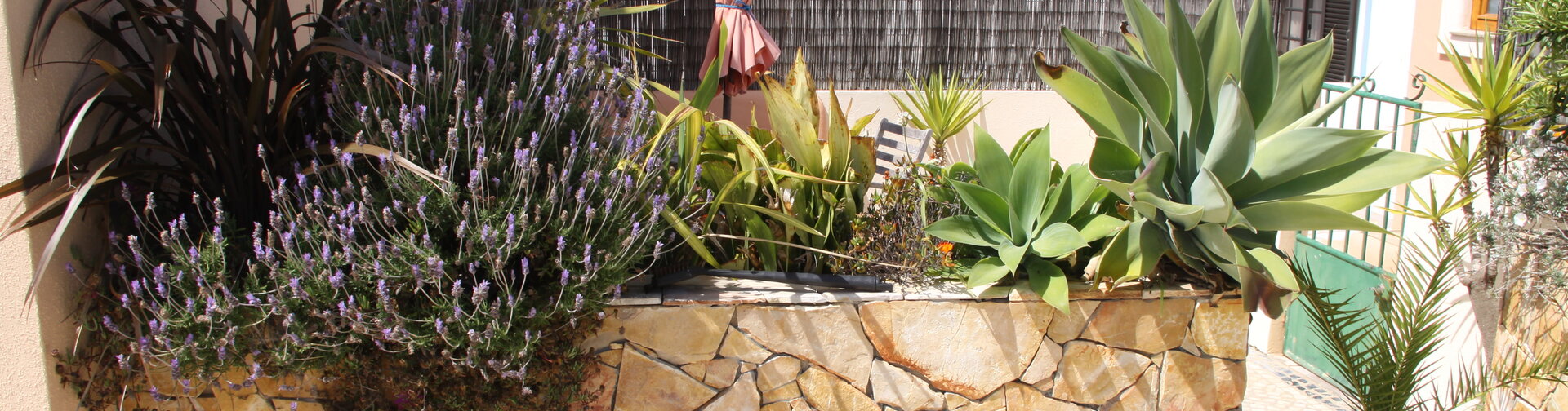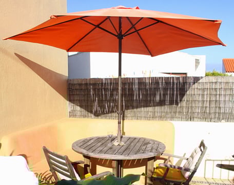 sunny patio garden complete with table, hand-built outdoor sofa, chairs, sunshade, lovely plants, a BBQ and an outside tap to wash off wetsuits and sandy feet.